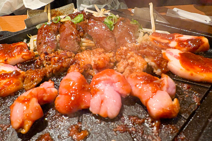 「私の故郷、庄原のブランド比婆牛A5のコウネ、カルビ、ハラミ、サーロインステーキなどは塩コショウでさっと炒めます。ホルモンは韓国産のピリ辛みそ炒めもお薦めです」