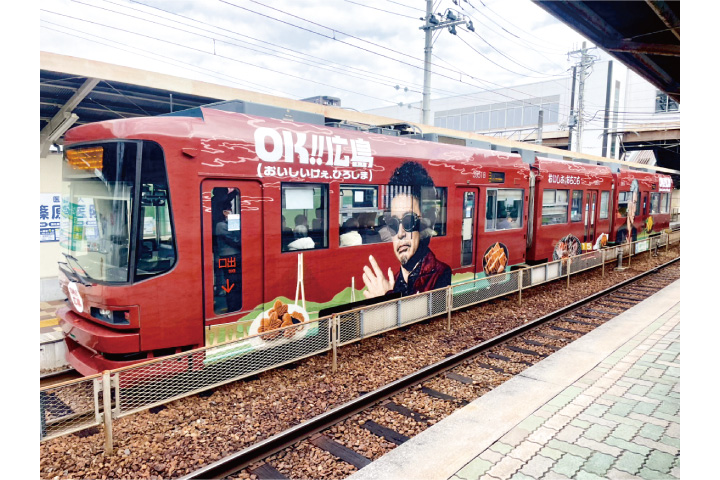 観光客に加え、県民にも多様な食資産に目を向けてもらいたいと、二人や比婆牛、アナゴなどの写真を載せたラッピング電車を3月末まで運行する。同様のデザインのポスターを飲食店などに提供。美容院や歯科医院など食以外の業種からも引き合いがあり、地域全体での機運醸成に一役買っている。