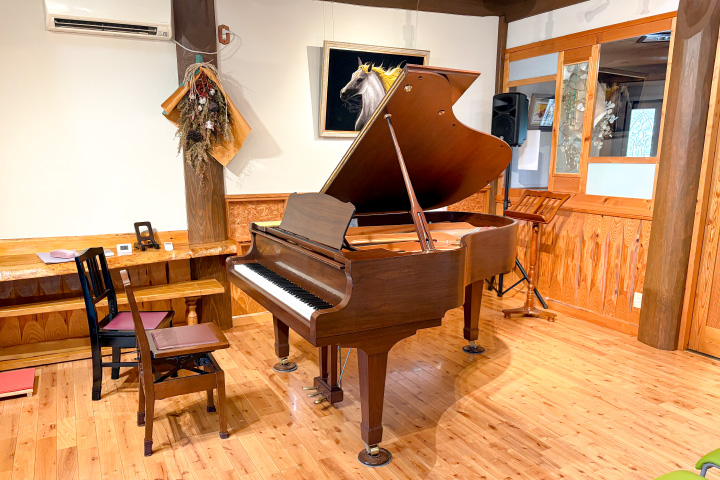 代表の両親が定年退職後の2009年に開業。23年に手作りした新棟で営業するカフェやギャラリーに加え、ミニコンサートなどを開く「音楽堂」を備える。