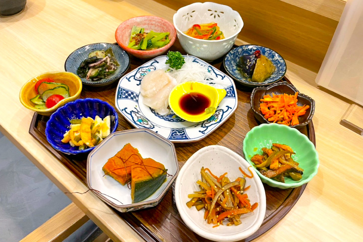 「毎日予約10食限定で煮物や揚げ物を盛り込む『お通し10種盛り』は、炒め物などのおばんざい5種食べ放題も付いて3500円。福祉に強い思い入れがあり、一部の下準備は中区の就労継続支援施設に依頼しています」