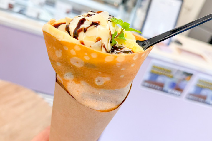 「料理好きが高じて新たなチャレンジをしたいと出店。イタリアで修行を積んだシェフからレシピ提供を受けました。クレープはもちもち生地で、クリームやフルーツをたっぷり使い、食べ応えを意識。甘い系だけでなくおかず系も豊富にそろえています」