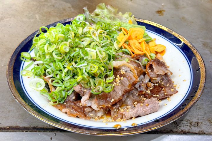 「私の故郷、庄原のブランド比婆牛A5のコウネ、カルビ、ハラミ、サーロインステーキなどは塩コショウでさっと炒めます。ホルモンは韓国産のピリ辛みそ炒めもお薦めです」